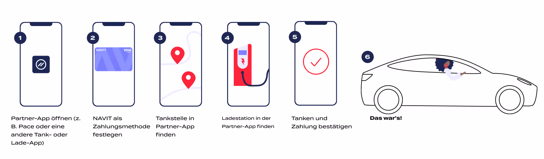 Beispielsweise kannst du die Pace-App, ryd-App oder ENBW-App nutzen. An der Tankstelle oder Ladestation kannst du dann direkt über die Partner-App mit der NAVIT Tank- & Ladekarte als Zahlungsmethode bezahlen.