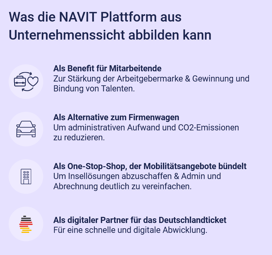 Der Dienstwagen - ein Relikt aus Zeiten, in denen Individualität vorwiegend über das eigene Fahrzeug definiert wurde. NAVIT bietet eine Alternative und eröffnet Unternehmen die Chance, mit einem Mobilitätsbudget nicht nur den individuellen Mobilitätsbedürfnissen der Mitarbeitenden gerecht zu werden, sondern gleichzeitig administrativen Aufwand und CO2-Emissionen zu reduzieren. Durch das flexible Mobilitätsbudget als Ergänzung oder sogar Ersatz zum Dienstwagen wird eine moderne, ökologisch bewusste Botschaft vermittelt, die intern wie extern Wirkung zeigt und den Weg zu einer nachhaltigeren Unternehmensmobilität und -kultur ebnet.